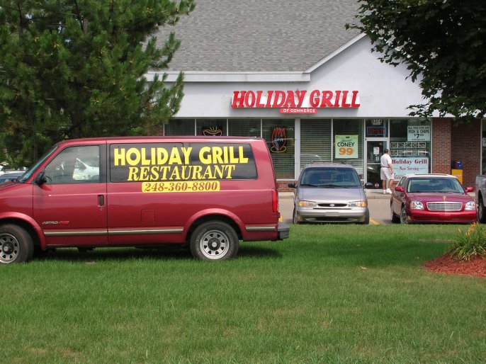 | Comments by Matt Fuerst Rating: 1 | This is going to be a bitter one. Lesson learned: we're always, always going to call these damn coney joints before we go there. We were both a little hesitant about the Holiday Grille and both myself and Mark had Freddie's Diner on our minds as we stepped out for lunch, but decided to brave another new restaurant. Holiday Grille offers $.99 coneys at lunchtime, so I thought we could get a good meal cheap. I'll just cut to the nitty gritty. Their chili is chili sauce. It's not chili. This is not chili. One more time just to get it off my chest, what the Holiday Grille puts into a bowl and sells as chili is a condiment that is solely meant to be used as a toppping for other items. This crap on top of chili dogs or fries might be decent (not really) but squirted into a bowl and dropped in front of you is sheer disappointment. No flavor, no beans, no anything. It's some squirty sauce stuff pumped into a bowl and delivered for your disappointment. What a bummer. Avoid at all costs. The chili dogs were lackluster as well. We should have hit Freddie's Diner. We braved this one for you dear readers... |